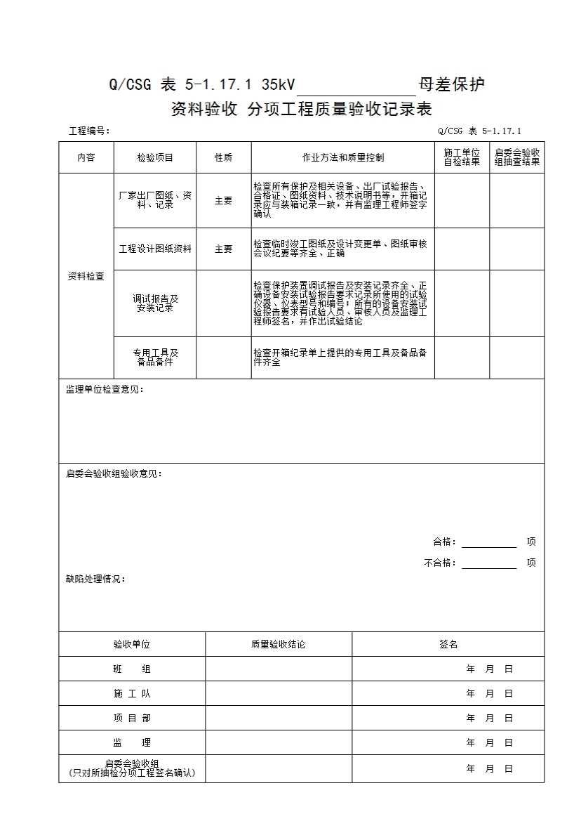 QCSG 表 5-1.17.1 35kV______母差保护资料验收 分项工程质量验收记录表