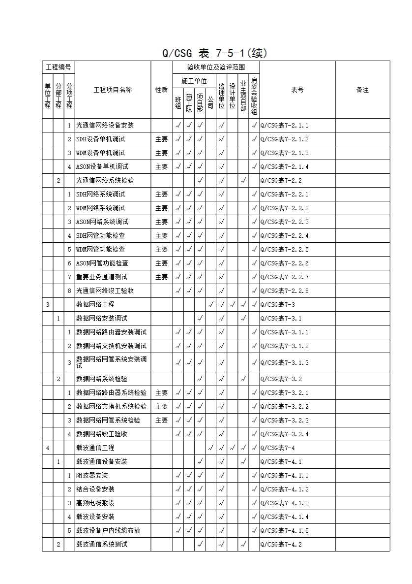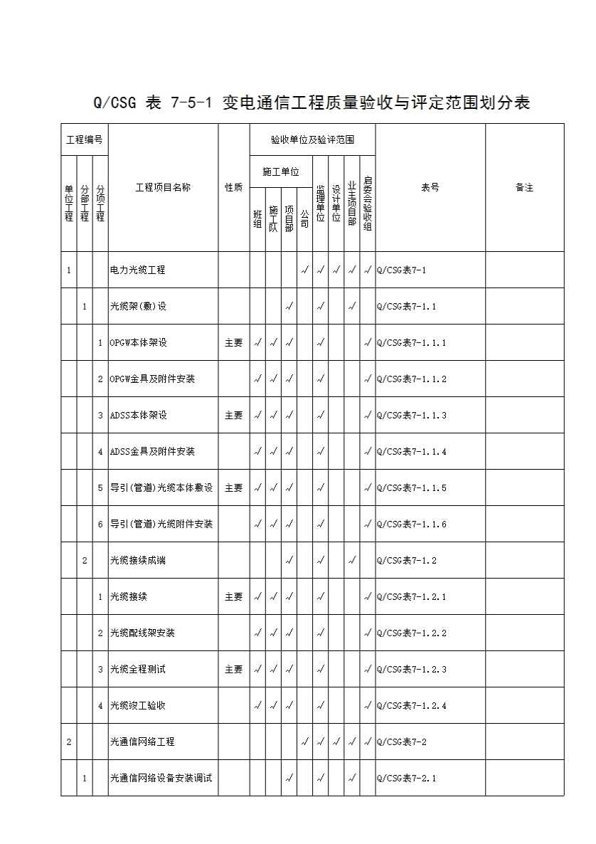 QCSG 表 7-5-1 变电通信工程质量验收与评定范围划分表