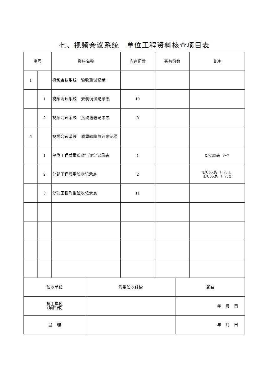 表格名称:七、视频会议系统 单位工程资料核查项目表