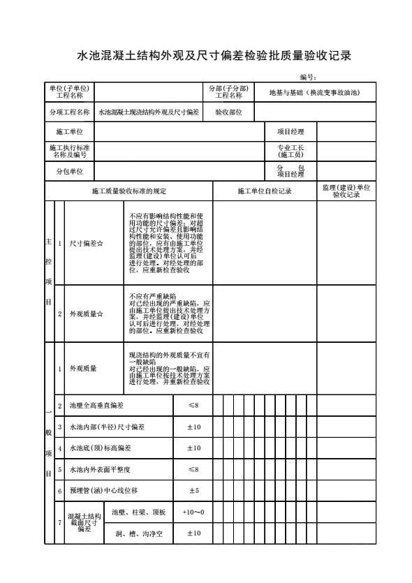 表格名称:水池混凝土结构外观及尺寸偏差检验批质量验收记录