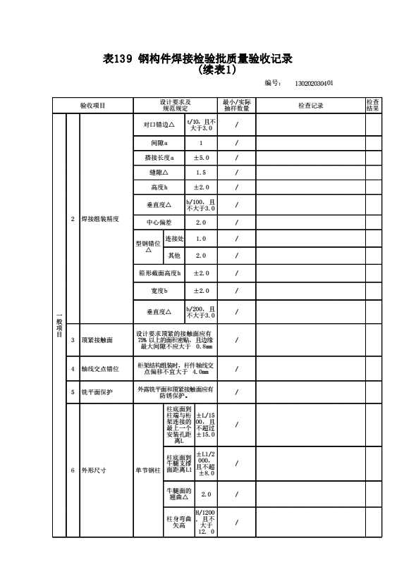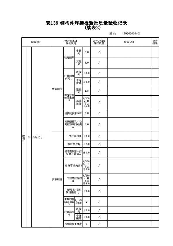 表格名称:130202030401 钢构件(单节、多节钢柱)组装检验批质量验收记录