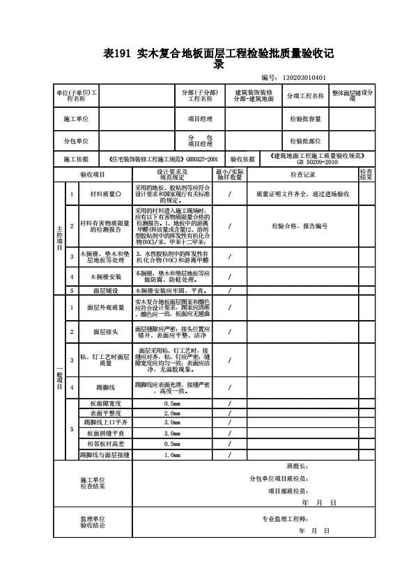 表格名称:130203010401 实木复合地板面层工程检验批质量验收记录