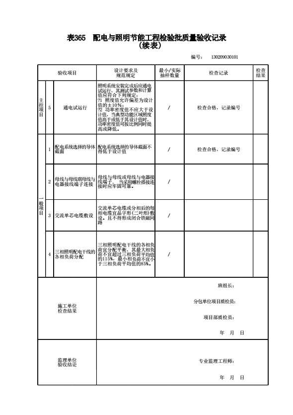 表格名称:010109030101 配电与照明节能工程检验批质量验收记录