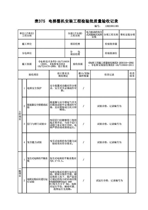 表格名称:130210011001 电梯整机安装工程检验批质量验收记录