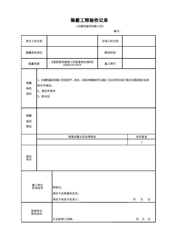 表格名称:隐蔽工程验收记录(内墙饰面砖粘贴工程)