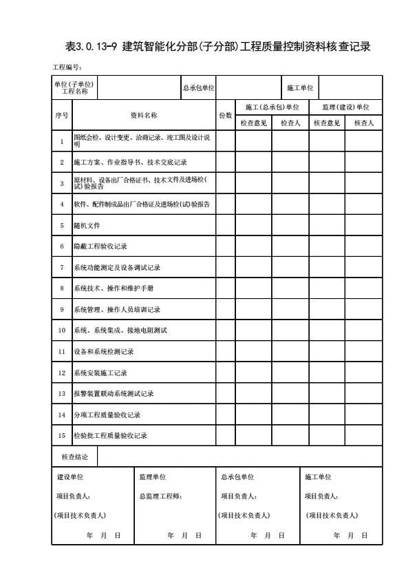 表格名称:表3.0.13-9 建筑智能化分部(子分部)工程质量控制资料核查记录