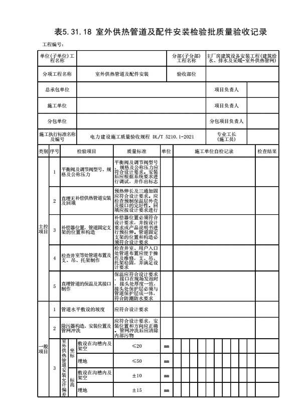 表格名称:表5.31.18 室外供热管道及配件安装检验批质量验收记录