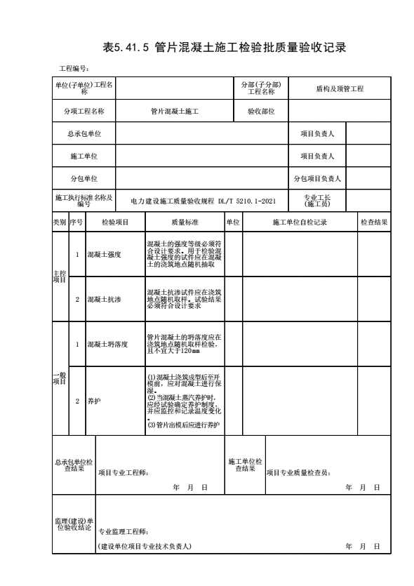 表格名称:表5.41.5 管片混凝土施工检验批质量验收记录