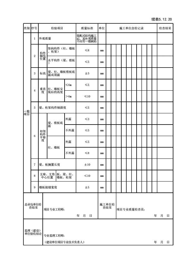 表格名称:[符合表5.12. 20]表6.3.7混凝土预制构件安装及连接检验批质量验收记录