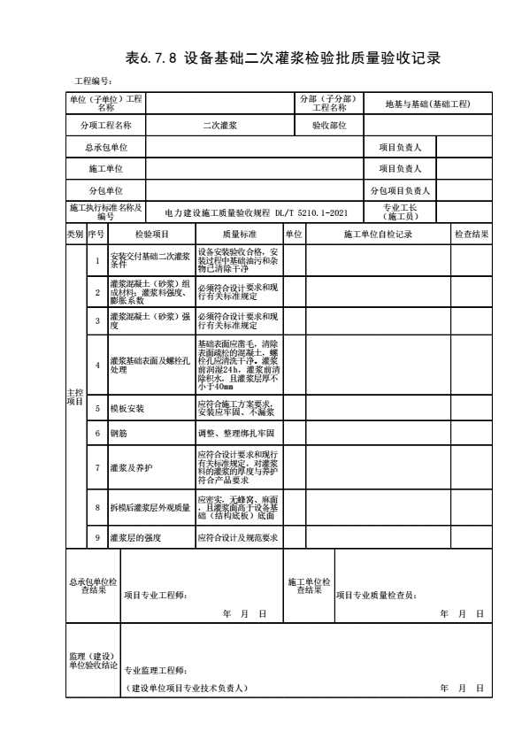表格名称:[符合表6.7.8]表6.10.8基础二次灌浆检验批质量验收记录