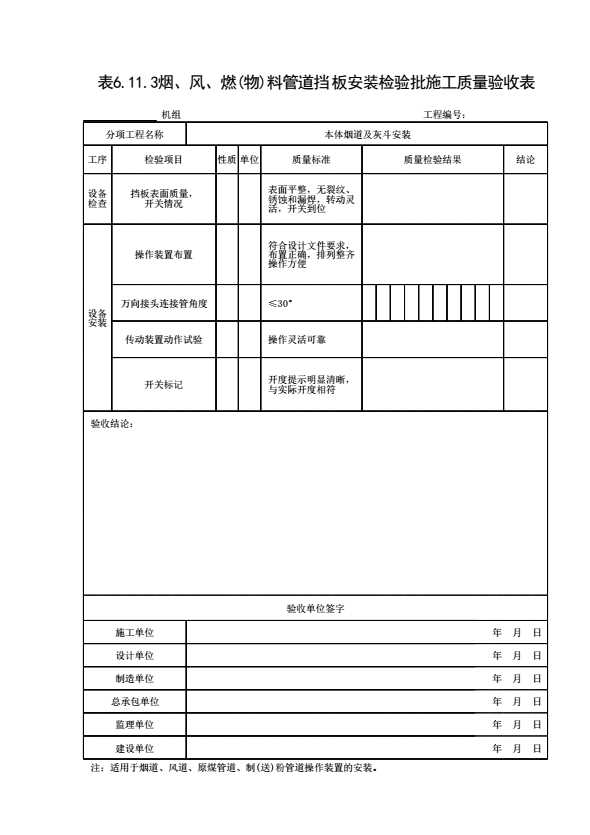 表格名称:表6.11.3 烟、风、燃(物)料管道挡板安装检验批施工质量验收表