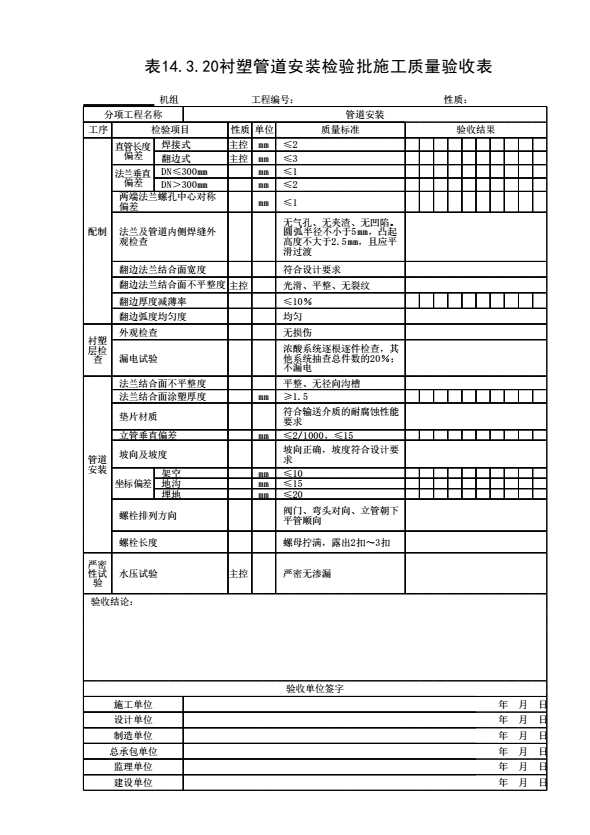 表格名称:表14.3.20 衬塑管道安装检验批施工质量验收表