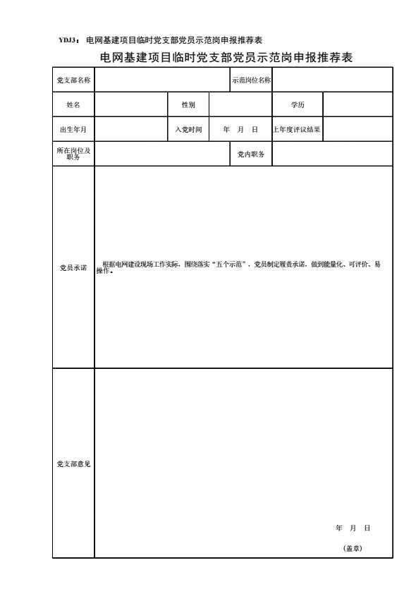 YDJ3:电网基建项目临时党支部党员示范岗申报推荐表