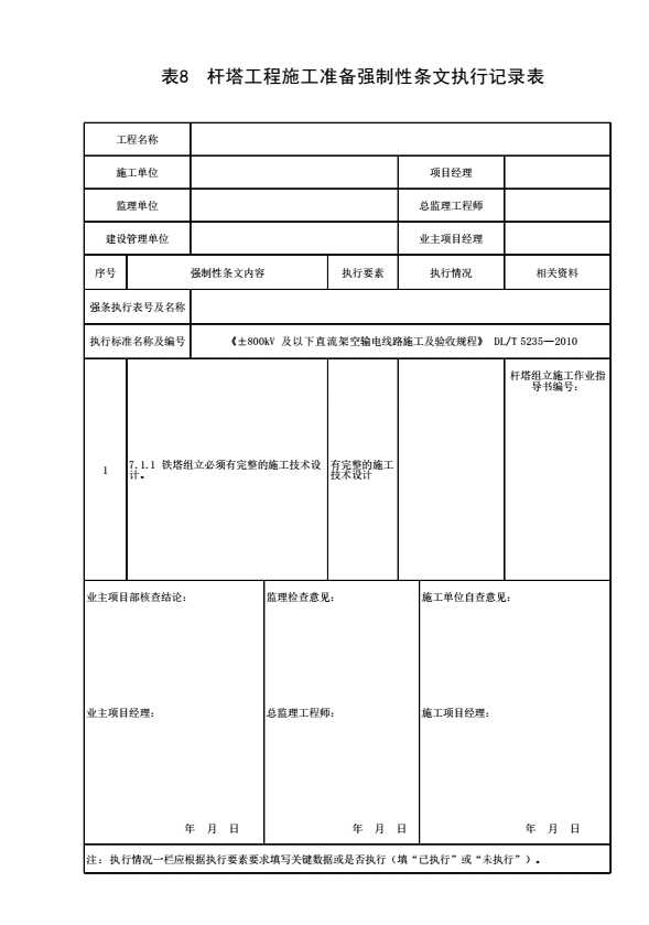 表格名称:表8 杆塔工程施工准备强制性条文执行记录表