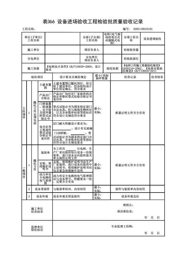 表格名称:020110010101 设备进场验收工程检验批质量验收记录
