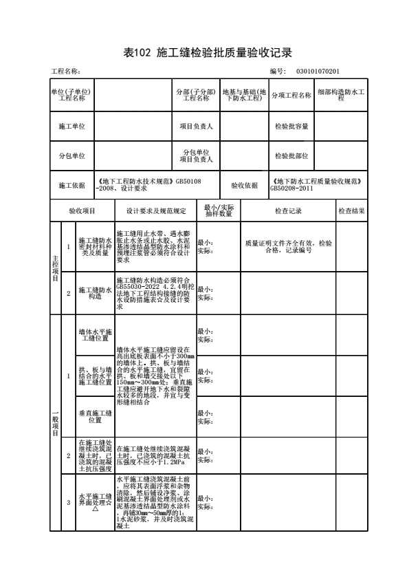 表格名称:030101070201 施工缝检验批检验批质量验收记录