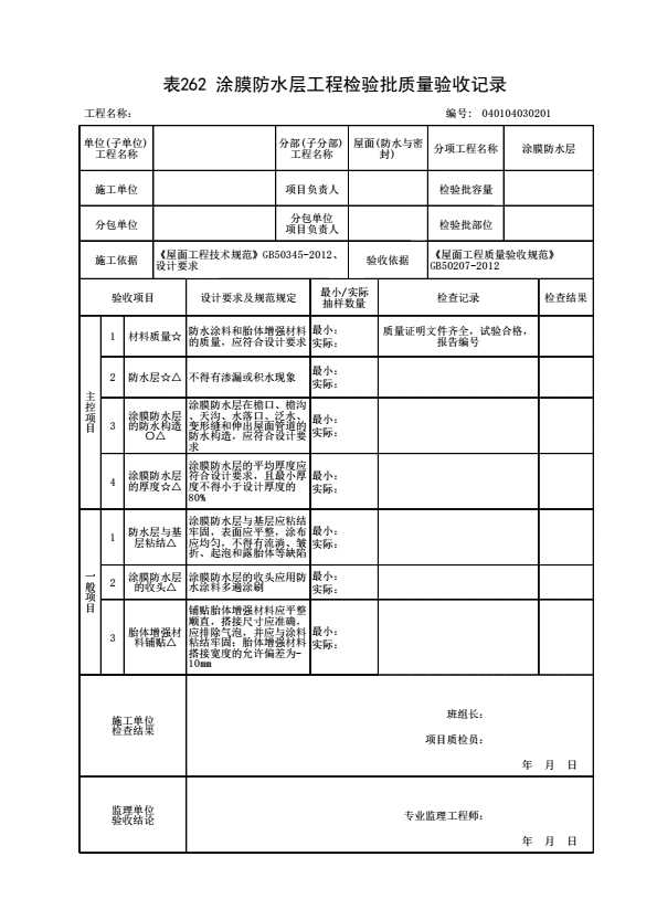 表格名称:040104030201 涂膜防水层工程检验批质量验收记录