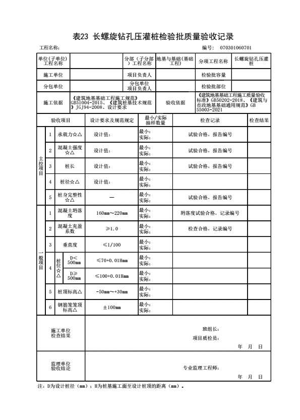 表格名称:070301060701 长螺旋钻孔压灌桩检验批质量验收记录