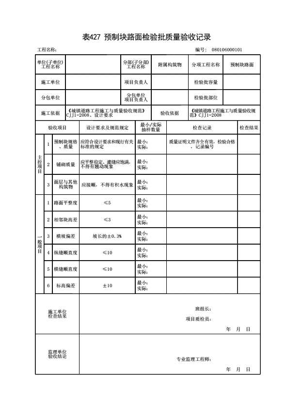 表格名称:080106000101 预制块路面检验批质量验收记录