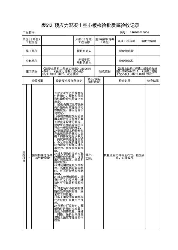 表格名称:140102010604 预应力混凝土空心板检验批质量验收记录