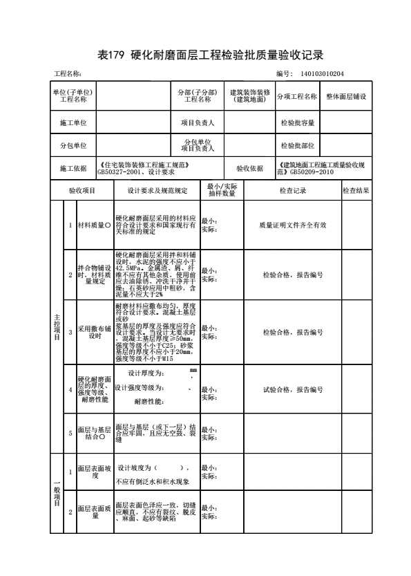 表格名称:140103010204 硬化耐磨面层工程检验批质量验收记录