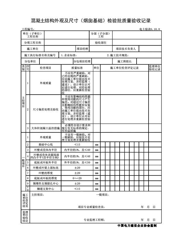 表格名称:电土验表6.10.8 混凝土结构外观及尺寸(烟囱基础)检验批质量验收记录
