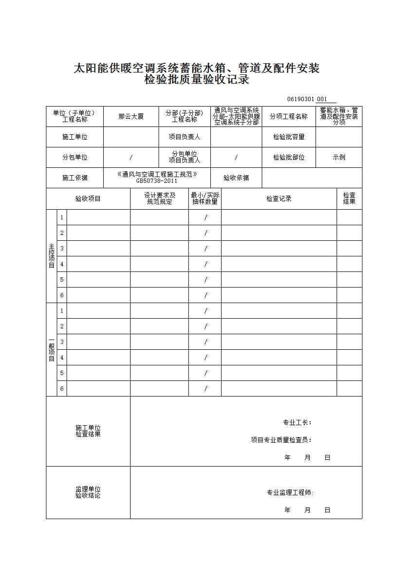 表格名称:06190301_太阳能供暖空调系统蓄能水箱、管道及配件安装检验批质量验收记录