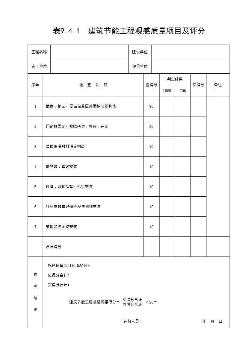 表格名称:表9.4.1 建筑节能工程观感质量项目及评分