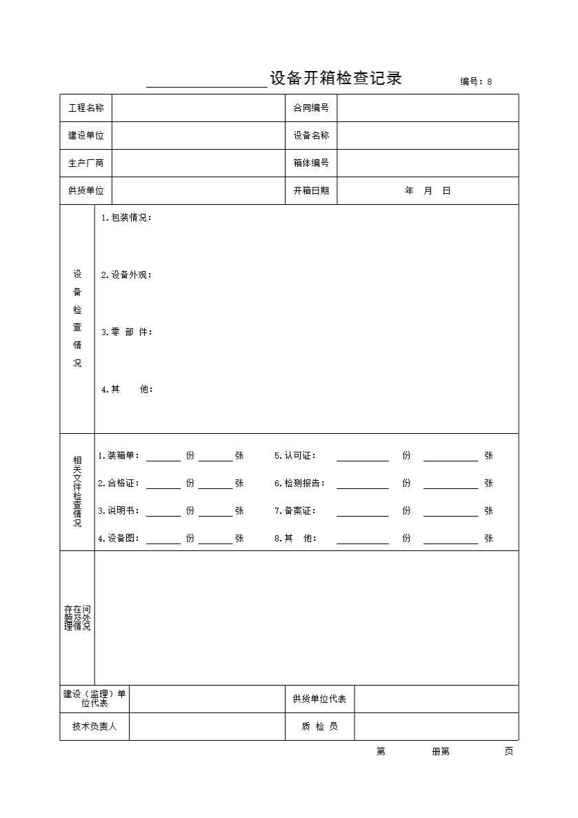 表格名称:_______设备开箱检查记录