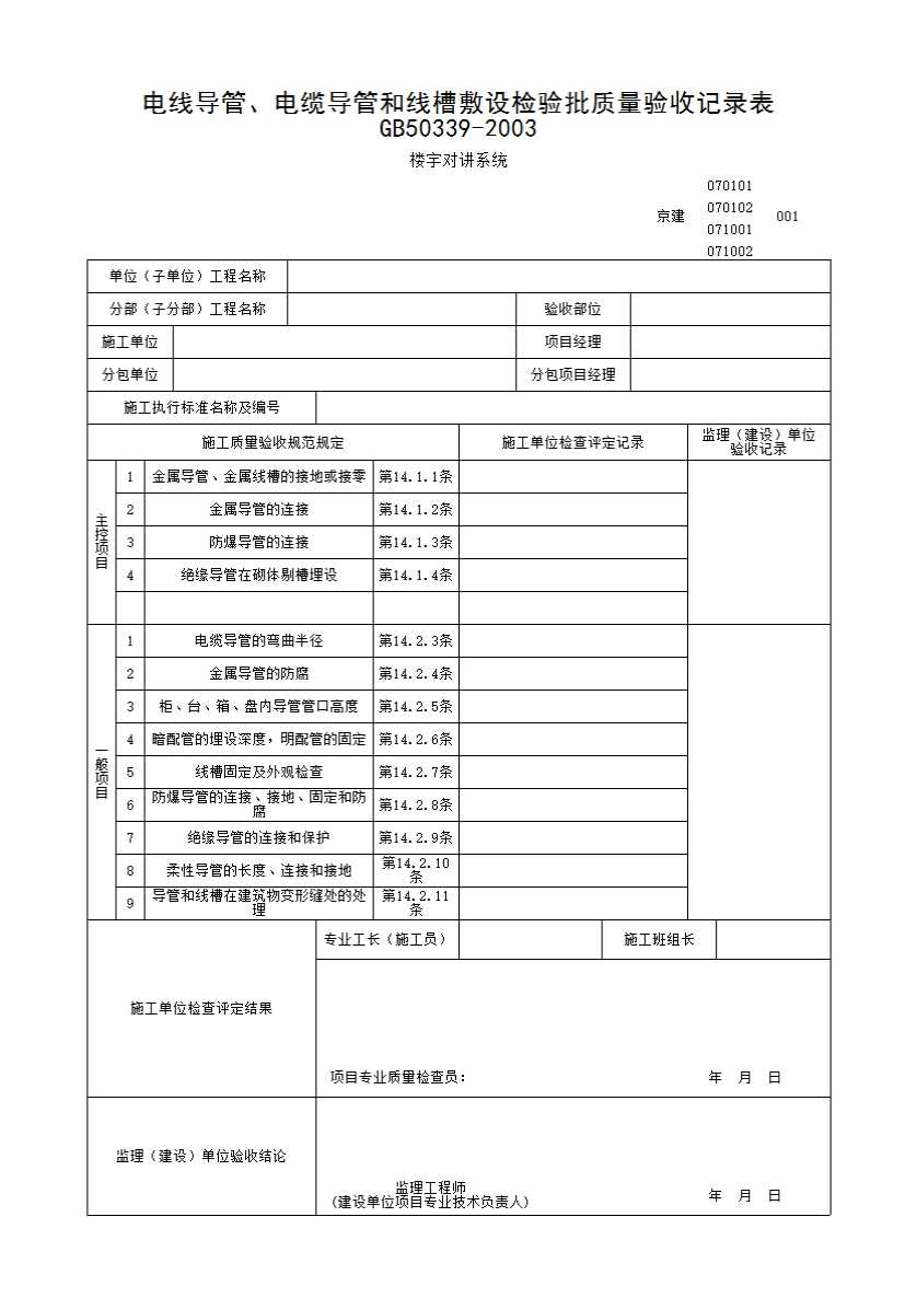表格名称:电线导管、电缆导管和线槽敷设检验批质量验收记录表(楼宇对讲系统)