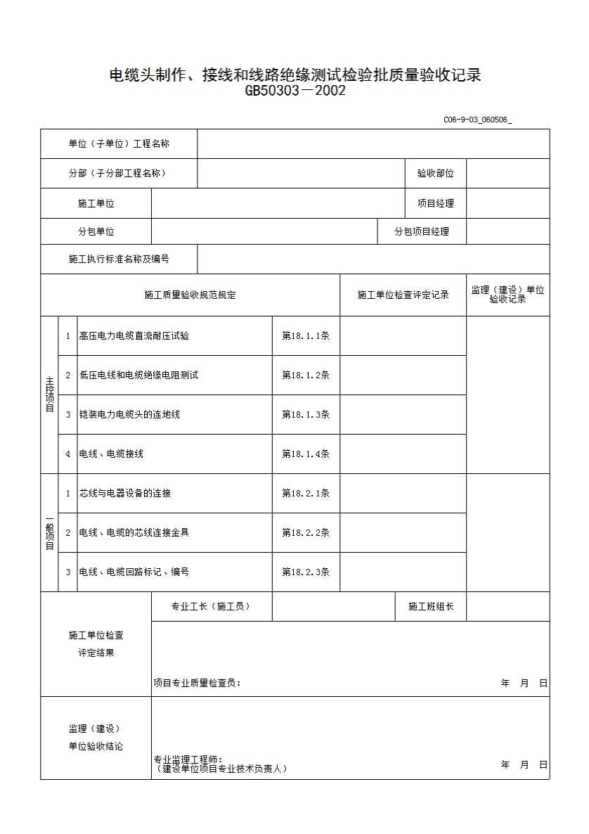 表格名称:电缆头制作、接线和线路绝缘测试检验批质量验收记录