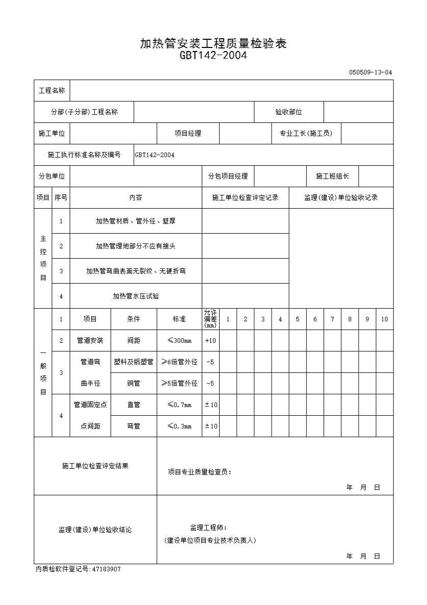 表格名称:5 加热管安装工程质量检验表