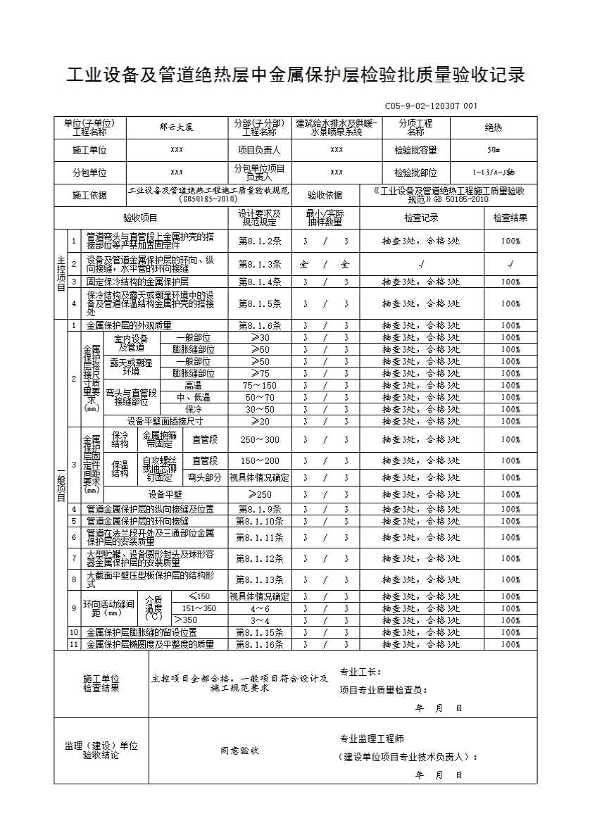 10.金属保护层膨胀缝的留设位置应符合设计要求或《工业设备及管道绝热工程施工质量验收规范》GB50185-2010中6.2.8条的规定,接缝应严密,搭接尺寸应正确,间距应均匀。