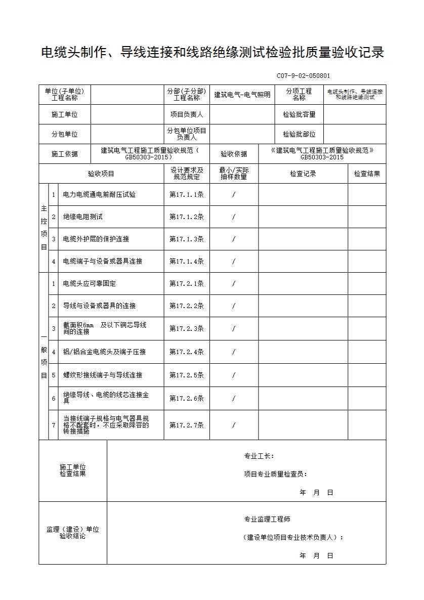 C07-9-02-050801电缆头制作、导线连接和线路绝缘测试检验批质量验收记录