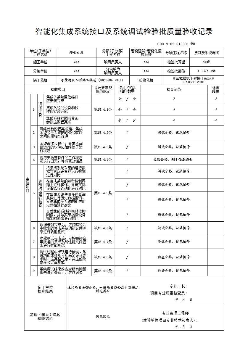 智能化集成系统接口及系统调试检验批质量验收记录