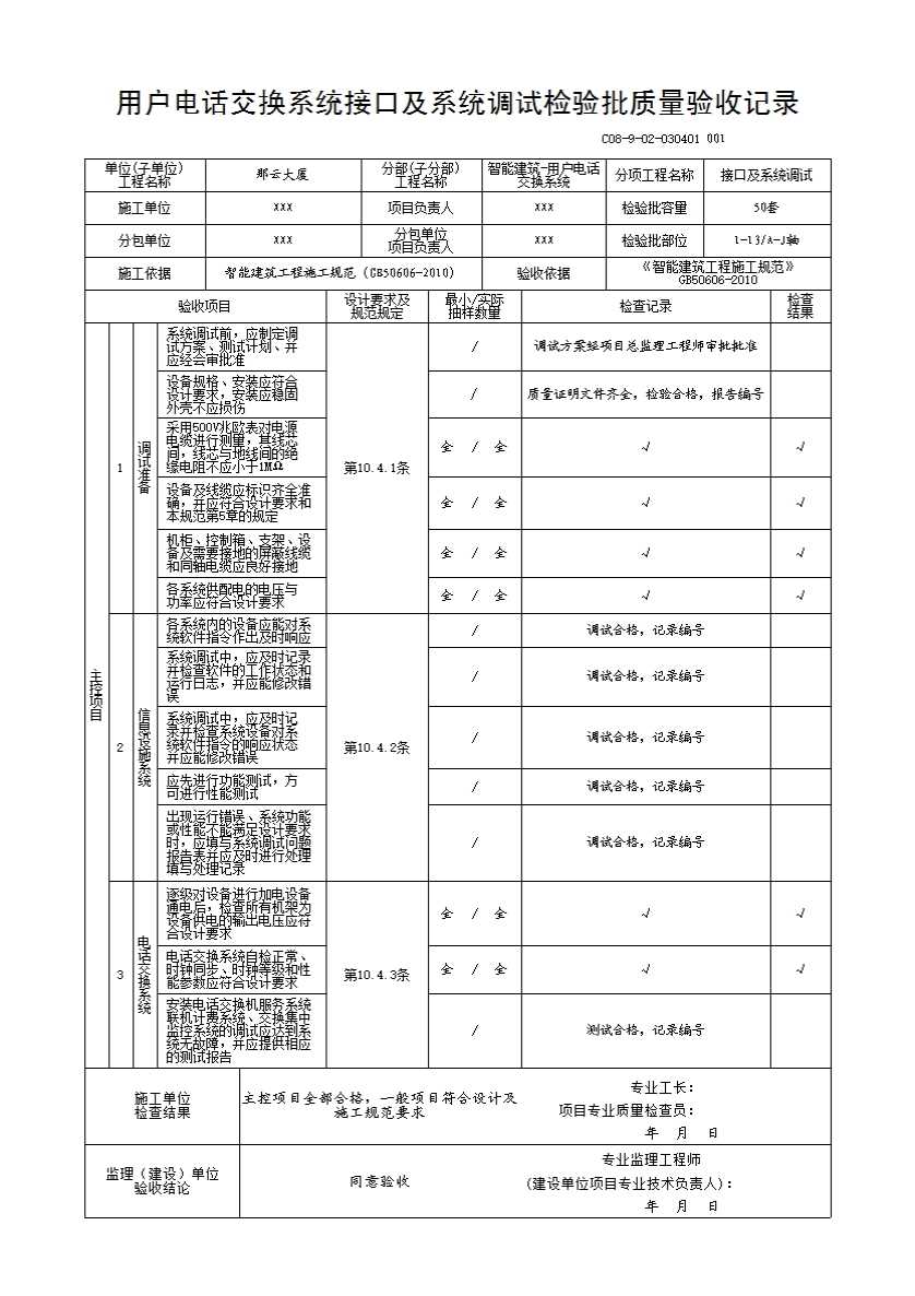 表格名称:C08-9-02-030401用户电话交换系统接口及系统调试检验批质量验收记录