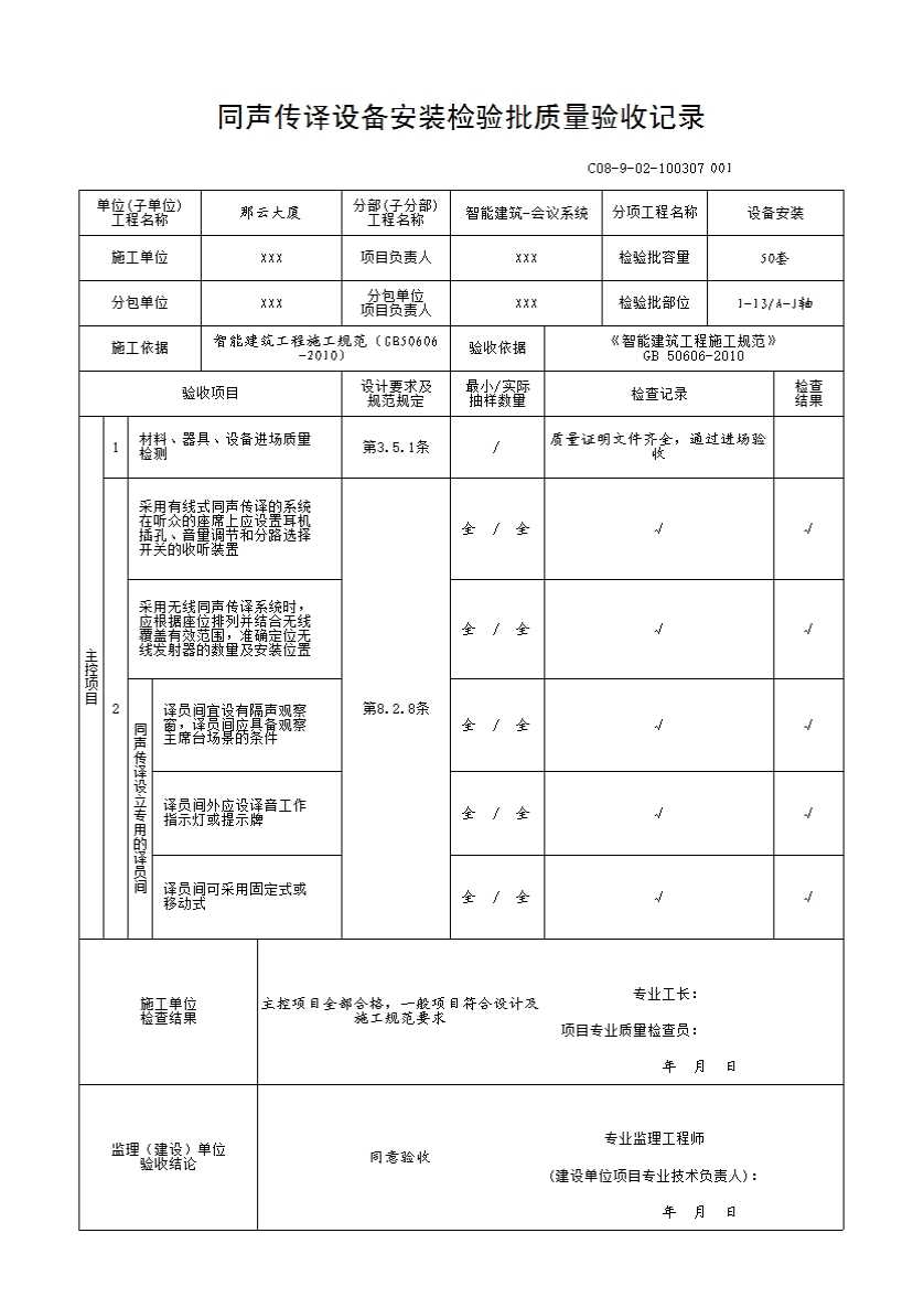 表格名称:C08-9-02-100307同声传译设备安装检验批质量验收记录