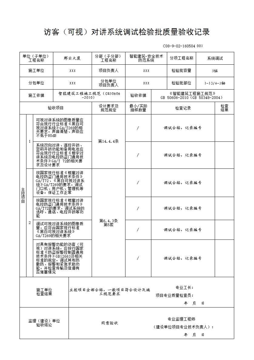 表格名称:C08-9-02-160504访客(可视)对讲系统调试检验批质量验收记录