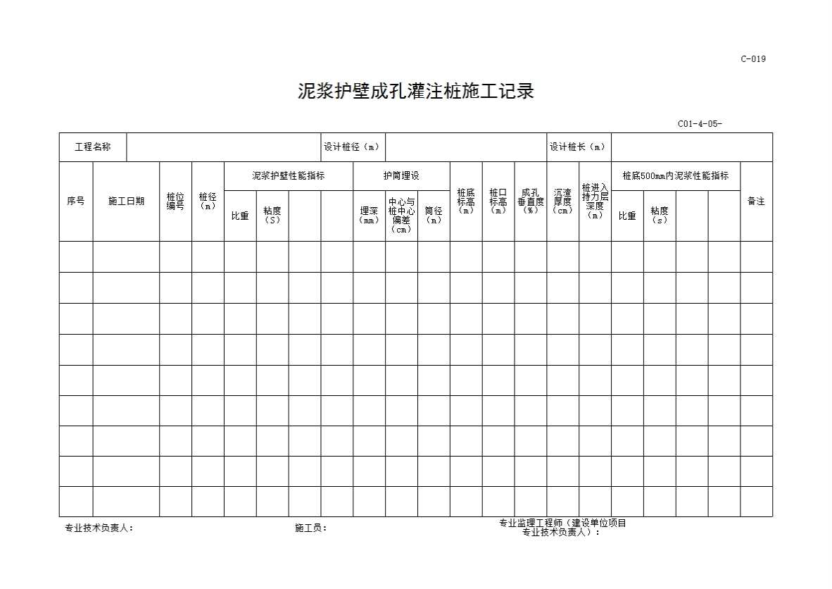 表格名称:C01-4-05-泥浆护壁成孔灌注桩施工记录