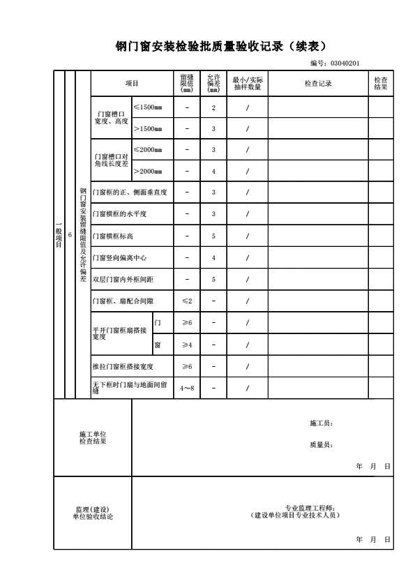表格名称:03040201 钢门窗安装检验批质量验收记录