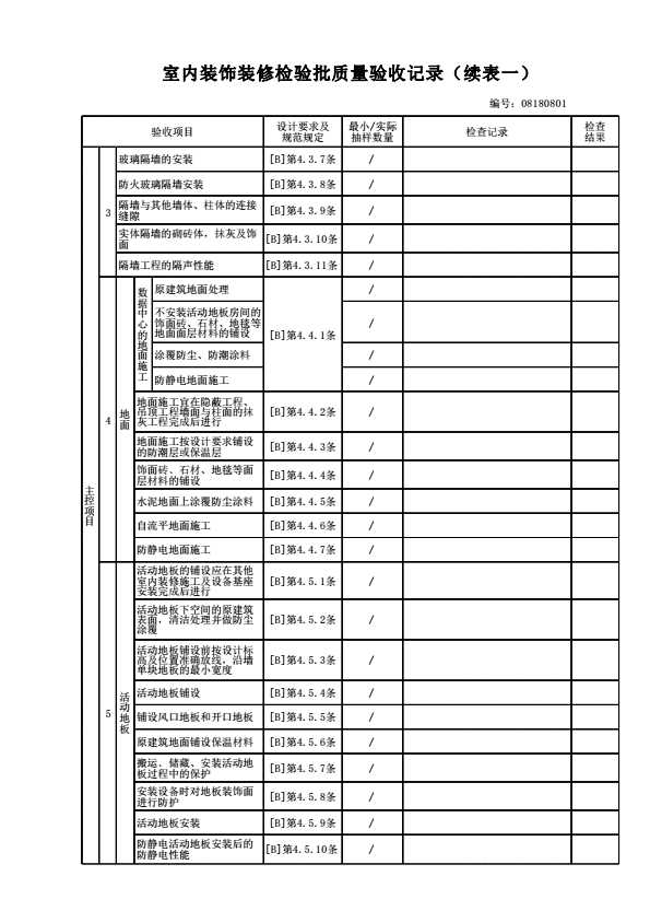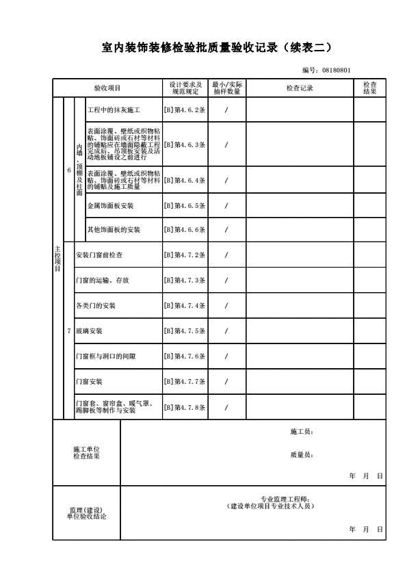 表格名称:08180801 室内装饰装修检验批质量验收记录
