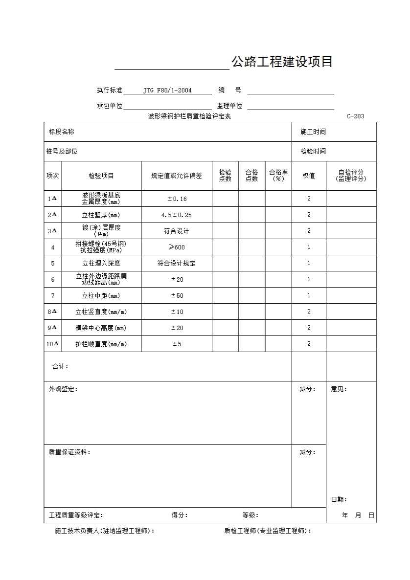 表格名称:C-203表 波形梁钢护栏质量检验评定表