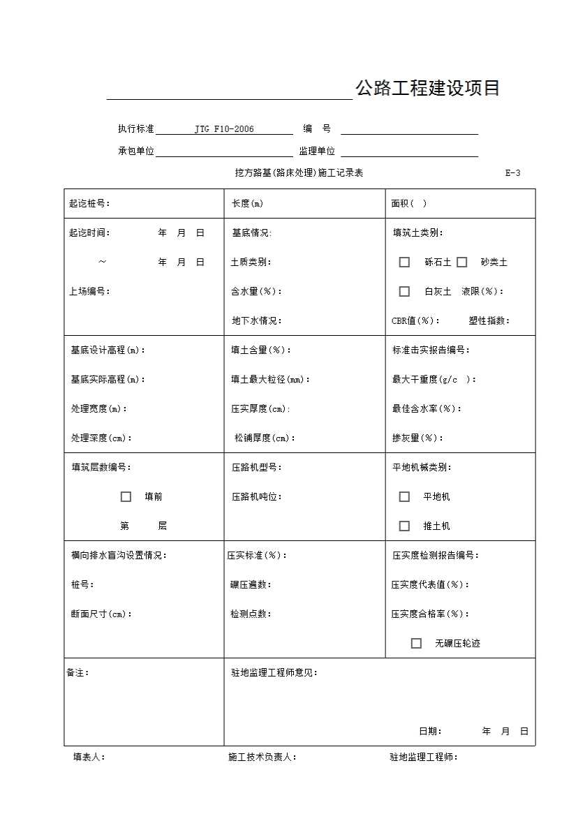E-3表 挖方路基(路床处理)施工记录表