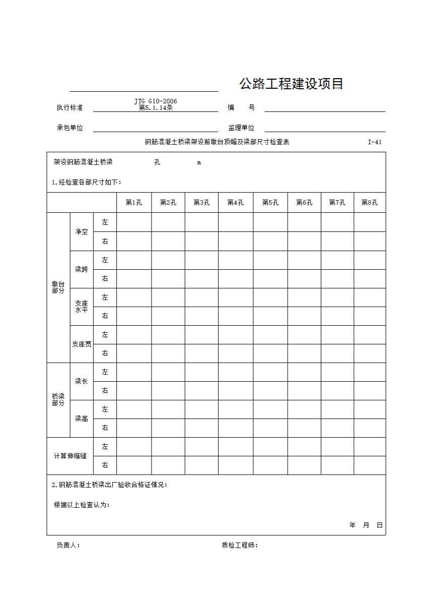 表格名称:I-41表 钢筋混凝土桥梁架设前墩台顶帽及梁部尺寸检查表