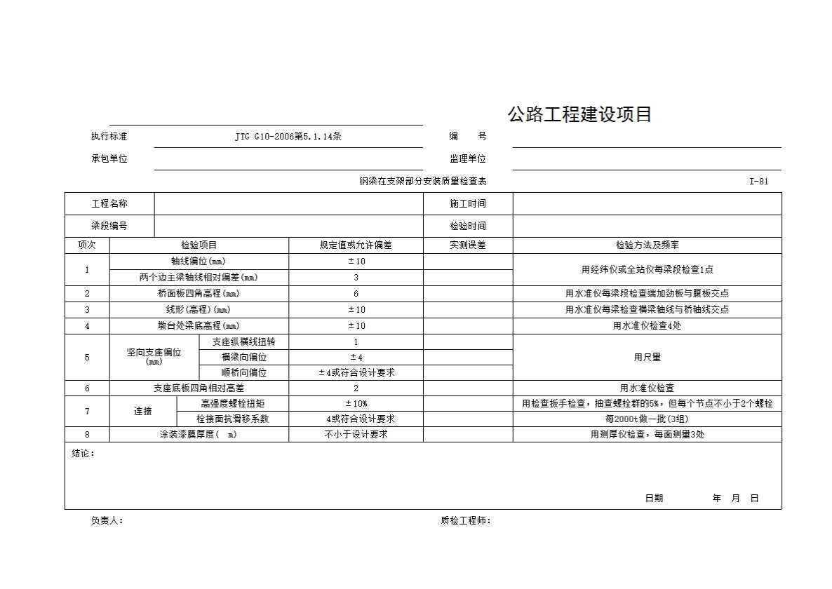 表格名称:I-81表 钢梁在支架部分安装质量检查表