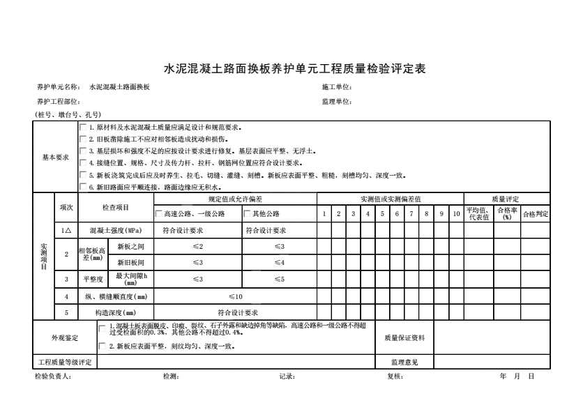 水泥混凝土路面换板养护单元工程质量检验评定表