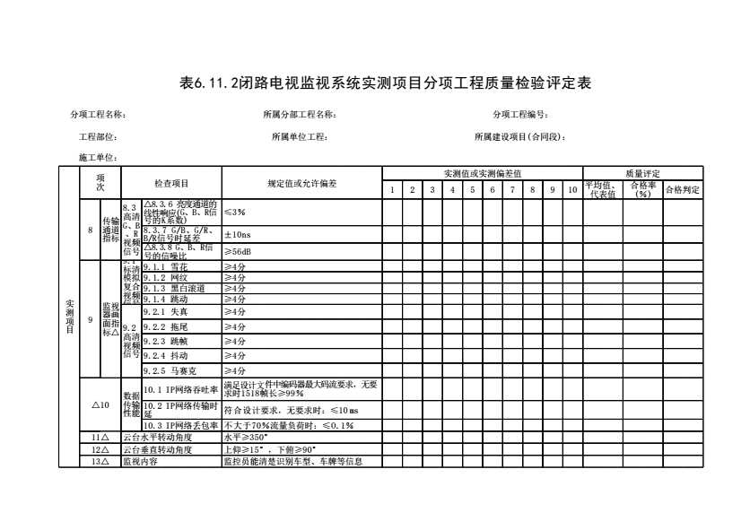 表6.11.2 闭路电视监视系统实测项目分项工程质量检验评定表