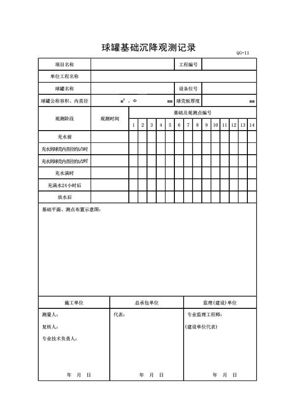 表格名称:QG-11 球罐基础沉降观测记录