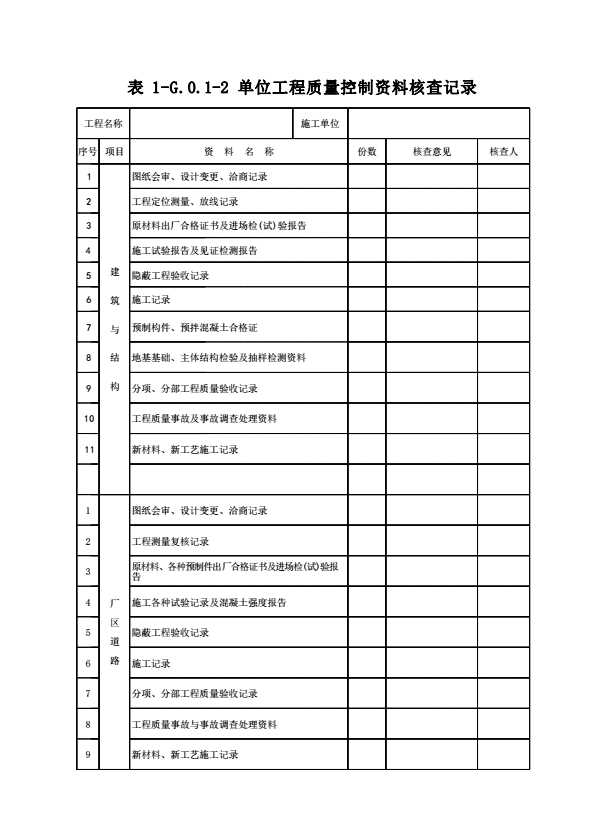 表1-G.0.1-2 单位工程质量控制资料核查记录