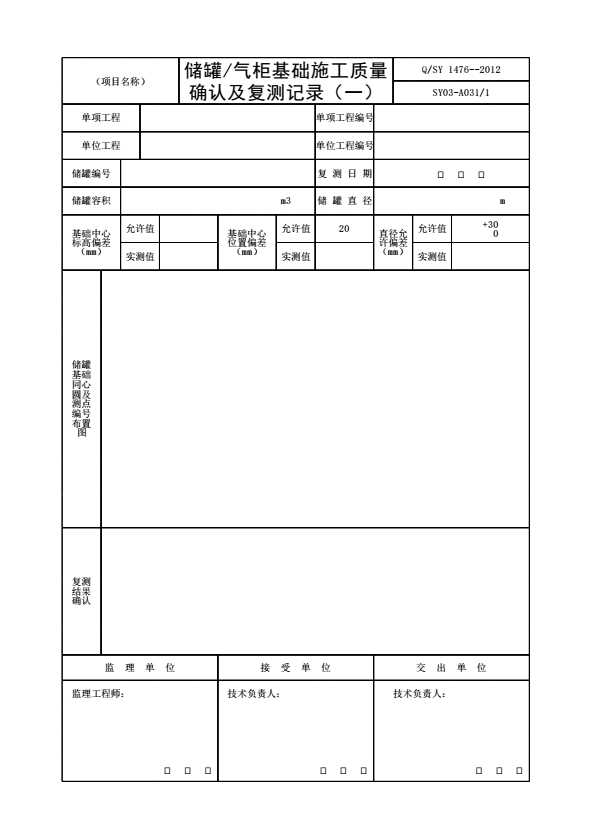 表格名称:SY03-A031/1 储罐/气柜基础施工质量确认及复测记录(一)